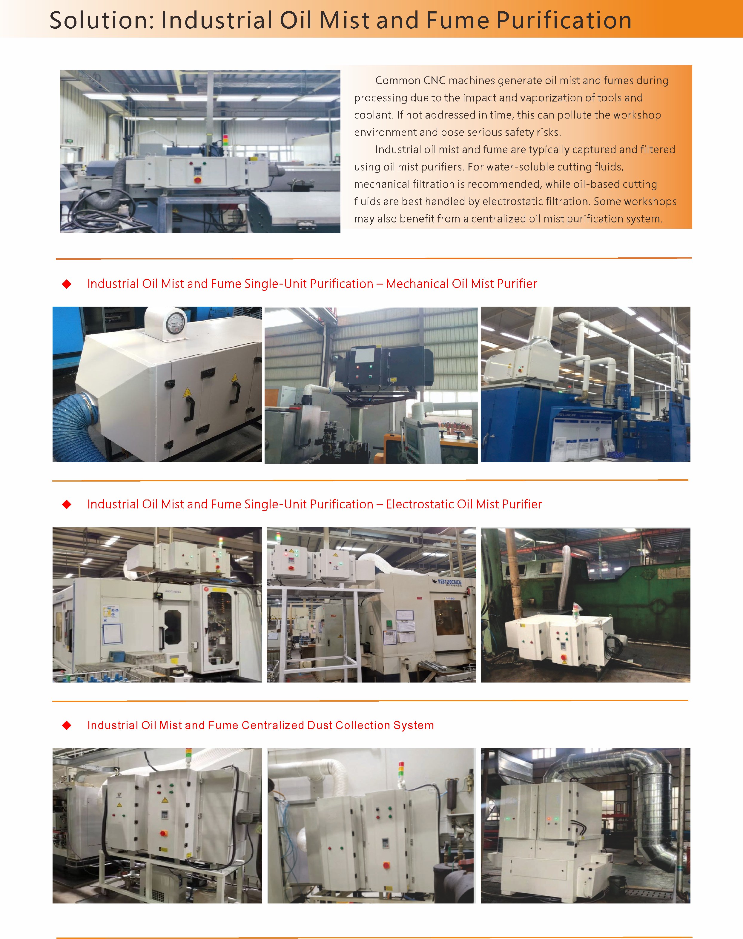 Industrial oil mist and fumes are effectively captured and filtered using specialized oil mist purifiers. For water-soluble cutting fluids, mechanical filtration is the recommended solution, whereas oil-based cutting fluids are most efficiently treated with electrostatic filtration technology. In certain facilities, centralized oil mist purification systems may offer an optimized approach for comprehensive air quality management.